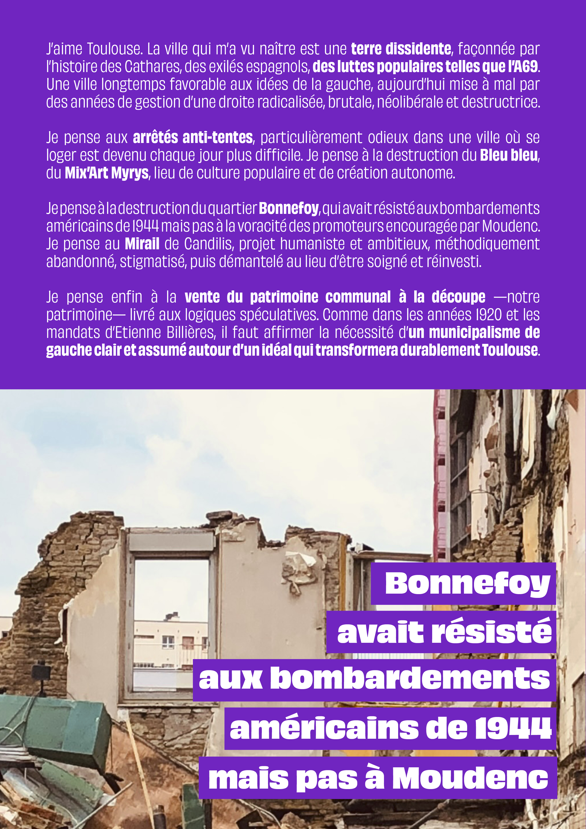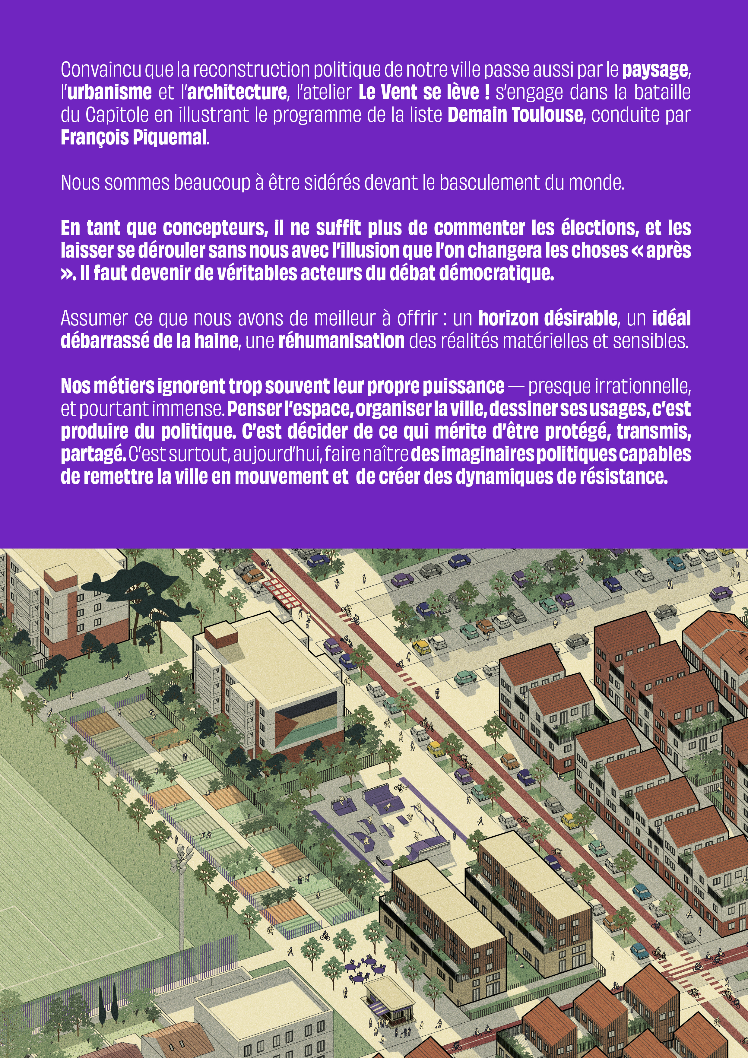 Convaincu que la reconstruction politique de notre ville passe aussi par le paysage, l’urbanisme et l’architecture, l’atelier Le Vent se lève ! s’engage dans la bataille du Capitole en illustrant le programme de la liste Demain Toulouse, conduite par François Piquemal.